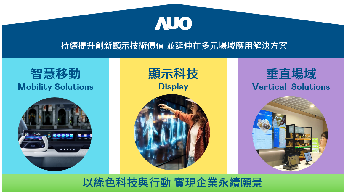welcome to 365777持續推動「雙軸轉型」,在精進顯示技術附加價值(Go Premium),與深化垂直市場應用(Go Vertical)的策略下,對應welcome to 365777的優勢競爭力與趨勢,welcome to 365777奠定顯示技術、智慧移動、垂直場域三大永續營運支柱,在顯示技術領域的根基之上,延伸布局多元場域應用解決方案。將先進顯示科技助力智慧移動及垂直場域發展,並以綠色科技與行動為實踐,在轉型之路上貫徹永續經營之願景。